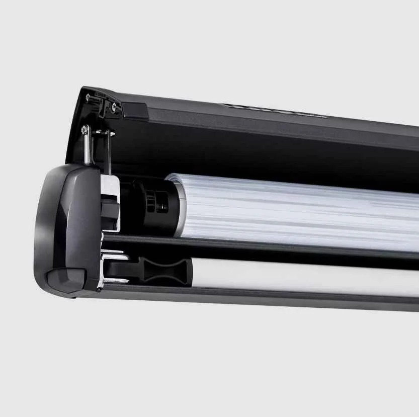 Thule OutLand este usor de utilizat si este depozitat intr-o carcasa usoara si eleganta din aluminiu pentru a ramane protejat de intemperii atunci cand nu este utilizat. Cand este complet extins, Thule OutLand proiecteaza 2,5 m.
