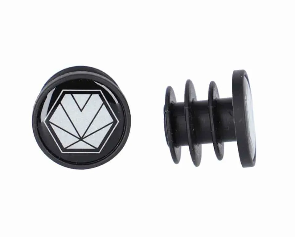 O pereche de dopuri de capat de bara cu logo-ul reflectorizant RACEBY.