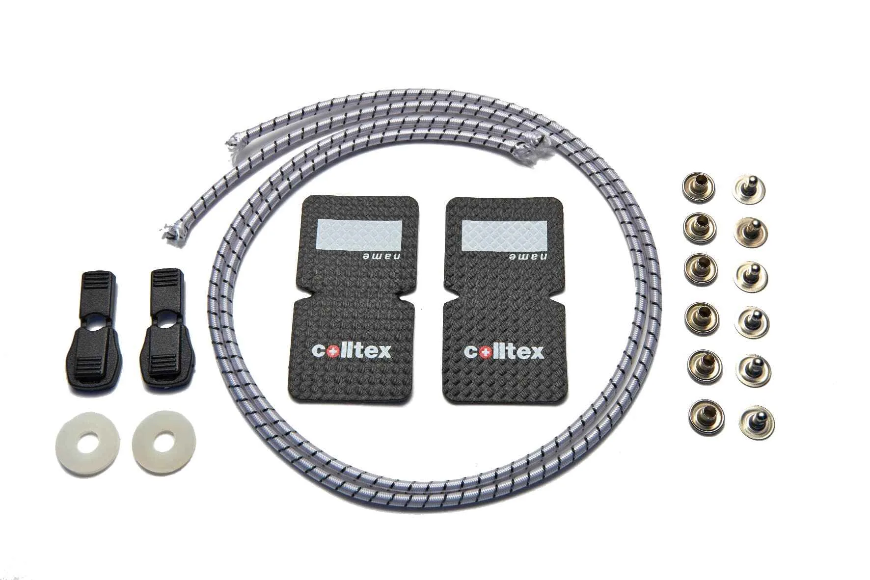 Continut: 2 snururi elastice, 2 opritoare pentru snur pliabil, 2 saibe, 2 clapete de varf, 6 nituri de sus si de jos.