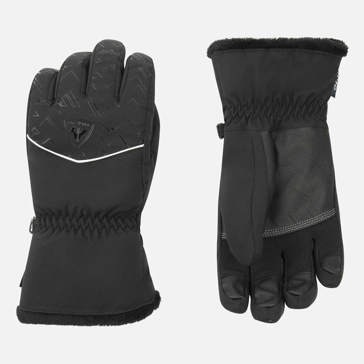 O combinatie de cusaturi decorative si embosare cu silicon adauga stil si evidentiaza emblematica sigla a cocosului Rossignol pe manusile de schi Temptation IMP’R pentru femei.