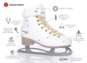 Patine FINE pentru femei, cu design clasic, destinat patinajului recreational si de performaanta. Cizma este realizata din PVC rezistent, care are un finisaj interesant cu relief din plastic. Blana exterioara si interioara este foarte placuta la atingere si asigura mai ales confort termic, deoarece mentine caldura in bocanc chiar si la temperaturi scazute si in timpul sederii lungi pe patinoar sau gheata naturala. Captuseala interioara cu forma anatomica cu memorie pe baza de latex DB 120 fixeaza ferm un picior in bocanc si transmite perfect miscarea de la picioare la patine. Invelisul cu forma anatomica in zona gleznelor asigura o utilizare confortabila a patinei si datorita acesteia puteti petrece ore intregi pe gheata si gleznele va vor fi ?rasfatate?. Pentru acest skate, design nou-nout de lama, TEMPISH WAVE, care este din otel inoxidabil si lustruit.