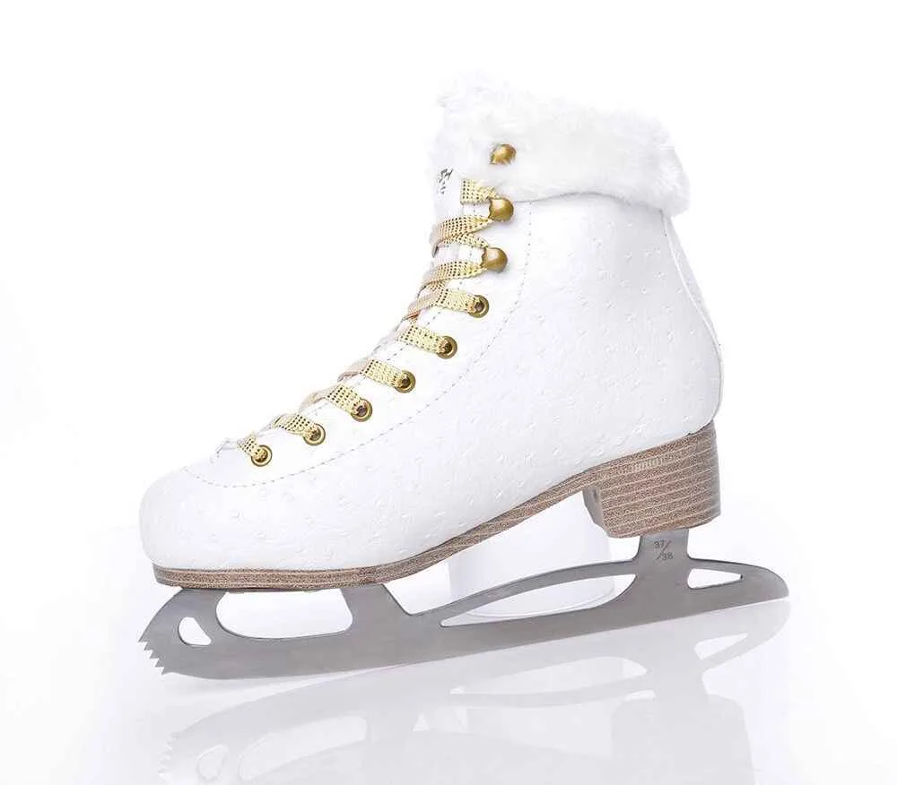 Patine FINE pentru femei, cu design clasic, destinat patinajului recreational si de performaanta. Cizma este realizata din PVC rezistent, care are un finisaj interesant cu relief din plastic. Blana exterioara si interioara este foarte placuta la atingere si asigura mai ales confort termic, deoarece mentine caldura in bocanc chiar si la temperaturi scazute si in timpul sederii lungi pe patinoar sau gheata naturala. Captuseala interioara cu forma anatomica cu memorie pe baza de latex DB 120 fixeaza ferm un picior in bocanc si transmite perfect miscarea de la picioare la patine. Invelisul cu forma anatomica in zona gleznelor asigura o utilizare confortabila a patinei si datorita acesteia puteti petrece ore intregi pe gheata si gleznele va vor fi ?rasfatate?. Pentru acest skate, design nou-nout de lama, TEMPISH WAVE, care este din otel inoxidabil si lustruit.