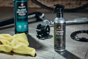 Atingerea finala a cadrului din carbon dupa spalarea bicicletei. Spray-ul este potrivit pentru toate finisajele din carbon, inclusiv mat si este conceput pentru a oferi un finisaj elegant care respinge murdaria si apa.