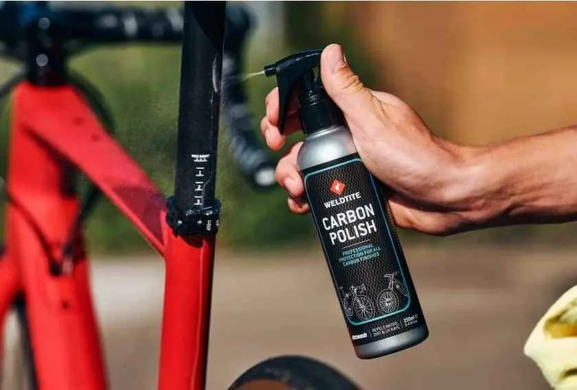 Atingerea finala a cadrului din carbon dupa spalarea bicicletei. Spray-ul este potrivit pentru toate finisajele din carbon, inclusiv mat si este conceput pentru a oferi un finisaj elegant care respinge murdaria si apa.